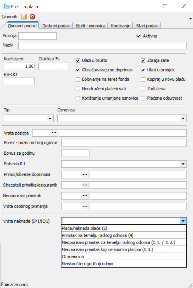 Pozicije plaća / Vrsta naknade (IP1/IO1)