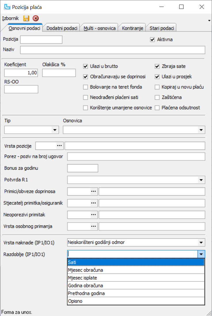 Unos plaće / Pozicije plaća / IP1 razdoblje (opisno)